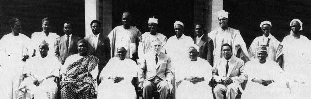 L-R: Minister of Works and Survey, Alhaji Inuwa Wada, Chief F.S. Okotie-Eboh, Prime Minister, Tafawa Balewa, British Governor General, James Robertson and other Federal Cabinet Ministers in 1960. Back row: Alhaji Maitama Sule. J.M Johnson.